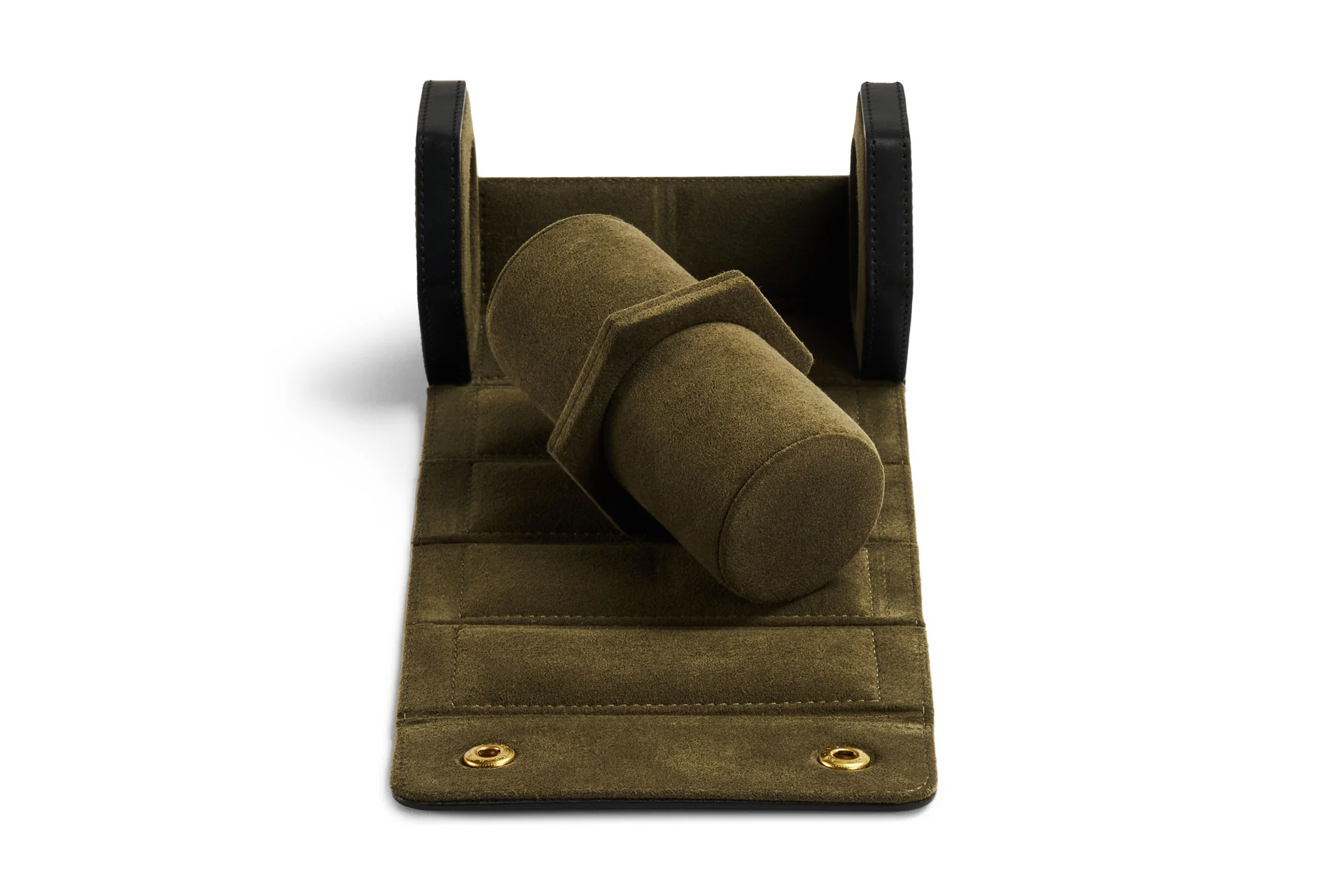 A lot of time has gone into these. Every black leather Bennett Winch Double Watch Roll is handmade in London by our team of master craftsmen. Tuscan leather panels cut from hand-selected hides surround a flexible Kevlar® core and cushioned Alcantara® suede lining. The result is a structure that transforms seamlessly from a rigid protective shell when closed, into a soft preparation and display surface when open. This is the future of time travel.