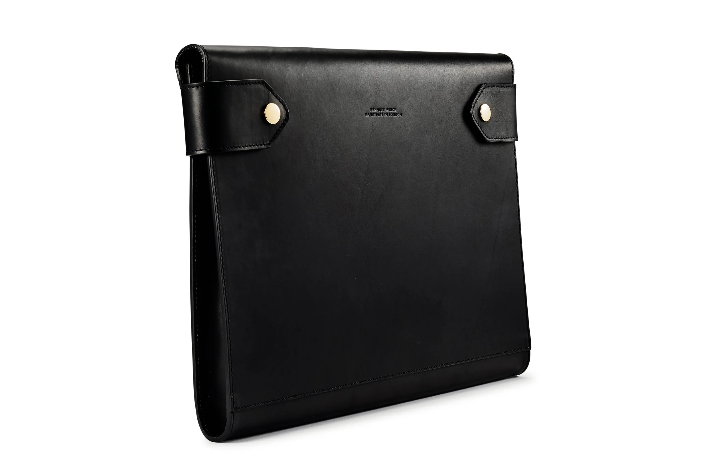 The perfect ally for your next meeting, the Bennett Winch Black Folio provides a sleek and stylish carry for documents or your laptop. Hand crafted in England from the finest Italian leather, we’ve even lined our folio in suede for an elegant approach to protecting its contents. With a timeless deep black leather offering a classic look that will age gracefully, we’ve made our folio big enough for a 16 inch MacBook, and a note pad / some paperwork and secured it with a set of uniquely placed brass poppers fasten to the back.