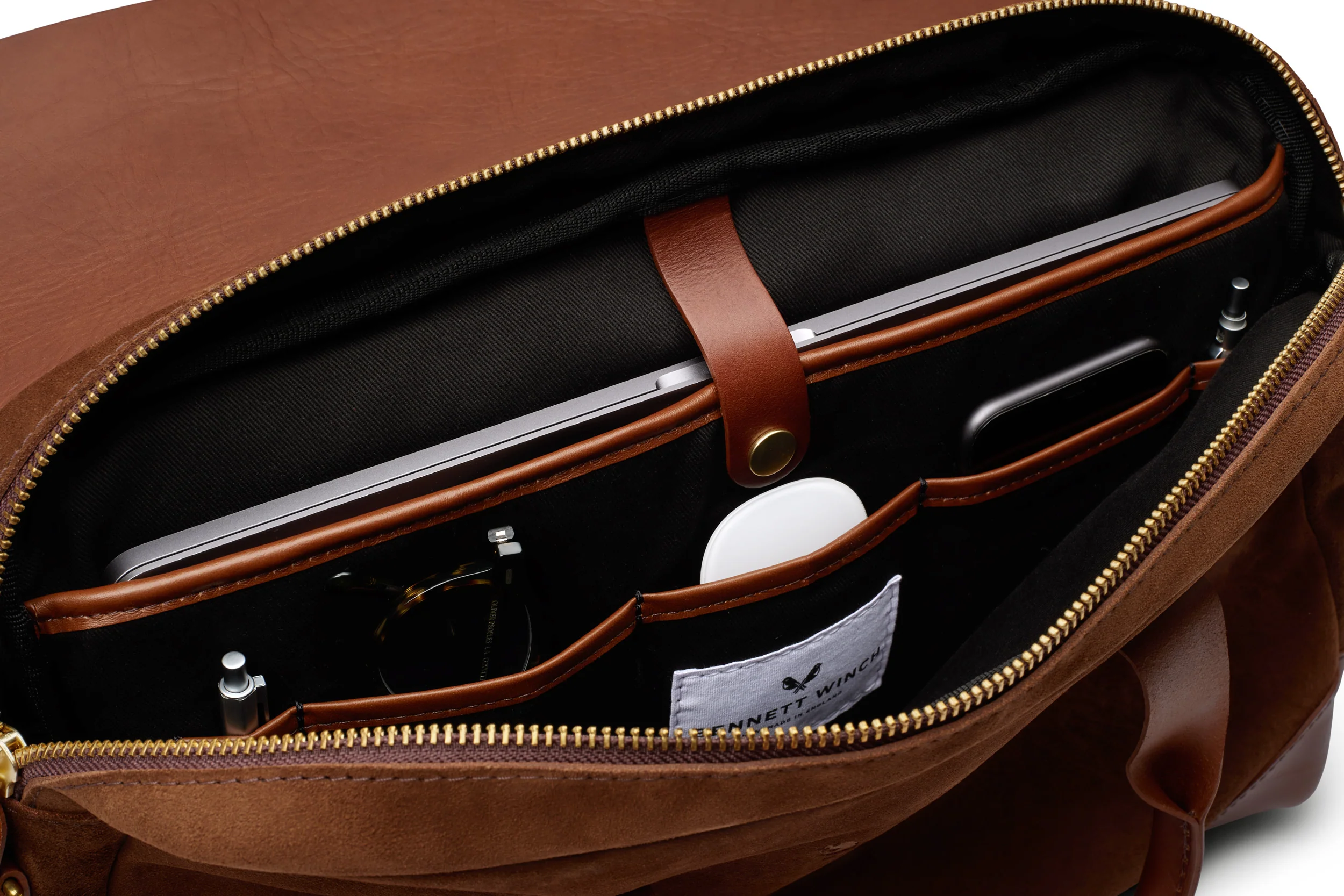 With space for the daily essentials, including internal pockets and a fully padded laptop sleeve, our brief features a full leather storm hood, and a sleeve to the reverse for securing to your suitcase. Handmade in England from a brown waterproofed Italian suede, the brief is soft in hand but hard wearing – the ultimate example of luxury that performs.