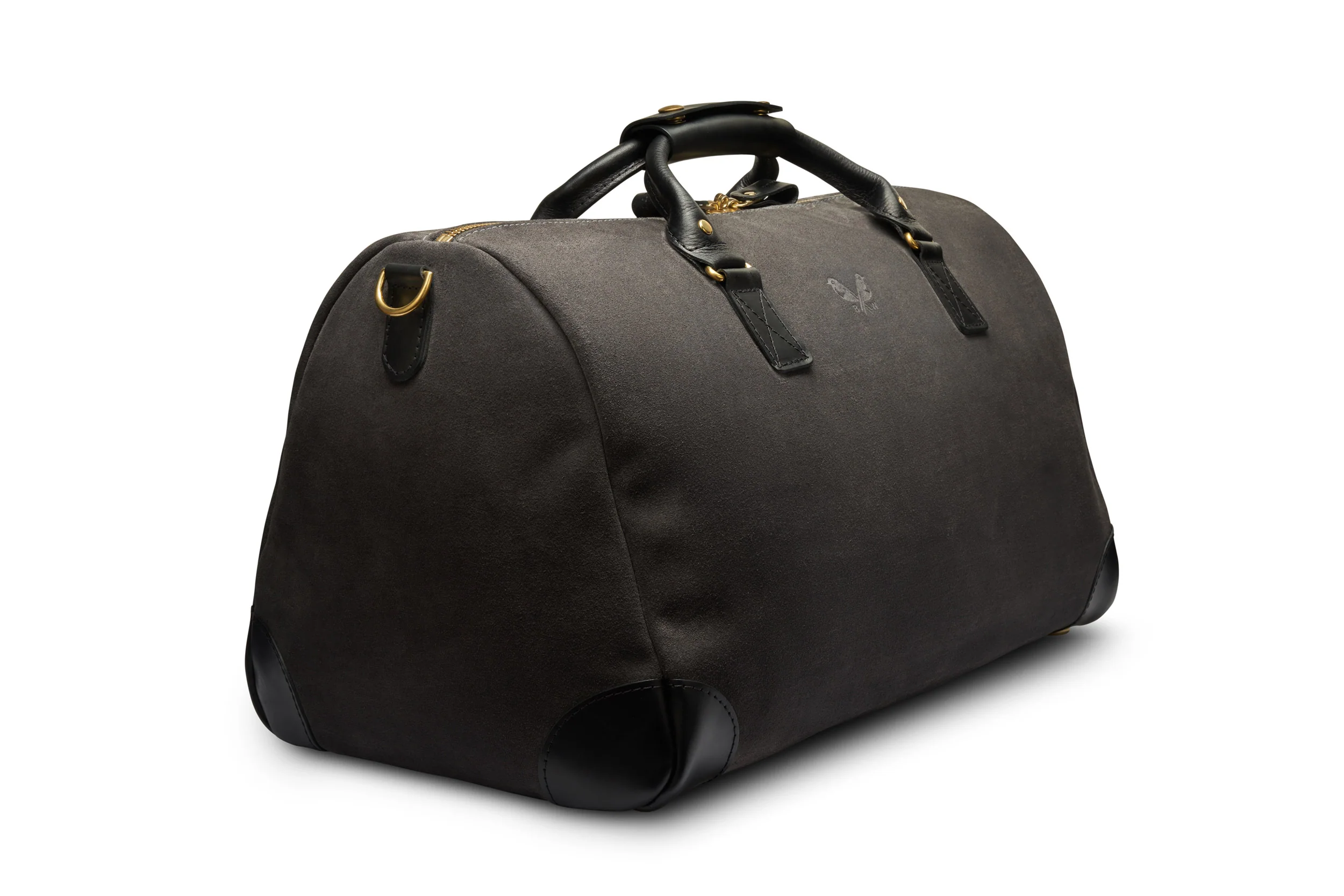 Our Italian suede is moss backed, making this handmade in England duffel completely waterproof, without losing the unique character of medium temper napped suede. With a removable internal wet pouch and fully padded laptop sleeve eliminating the chaos of a short trip, the commuter is held fast when on the move with veg tanned Tuscan leather handles, solid brass British-cast hardware and a clip-on shoulder strap.